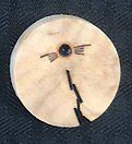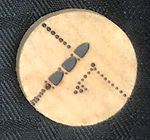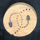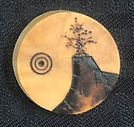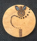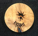 Sam discovers the compositional elements as each disc is created - determined partly by which nib he happens to have on his woodburning pen. The rest is decided by entering the state of mind so often discussed in creative and religious theory where the artist becomes a channel for something beyond their own individual intentions. The loss of egoic interference over the composition is the goal. Some reach the goal and some don't and after the moment is forgotten it's quite impossible to tell the difference of which is which. They're made in batches from crosscuts of a standard dowel, are about the size of a silver dollar and are double sided. He originally made about 150.